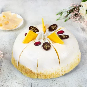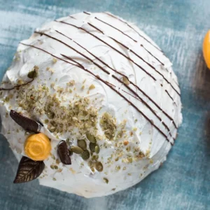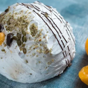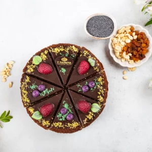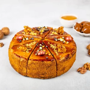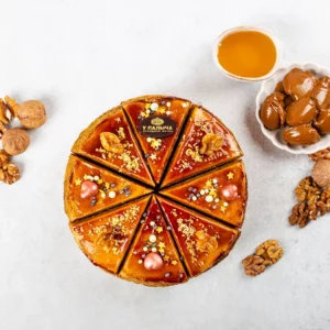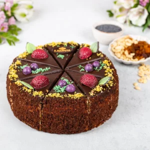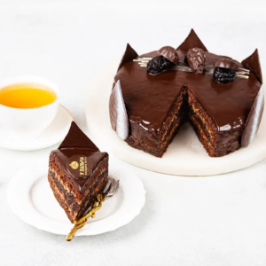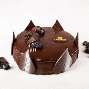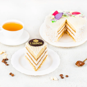 Три слоя воздушно-ореховых коржа из мелко дробленого ореха, яичного белка, сахара и муки. Прослоены сливочно-заварным шоколадным кремом с добавлением коньяка. Киевский торт покрыт сливочно-заварным шоколадным кремом, украшен веточкой с розой из сливочного крема, боковые стороны украшены шоколадной крошкой.